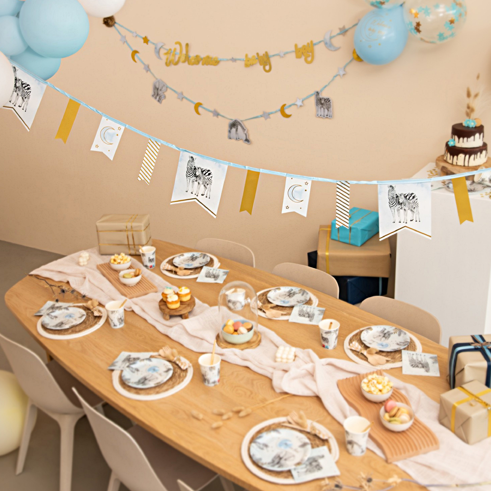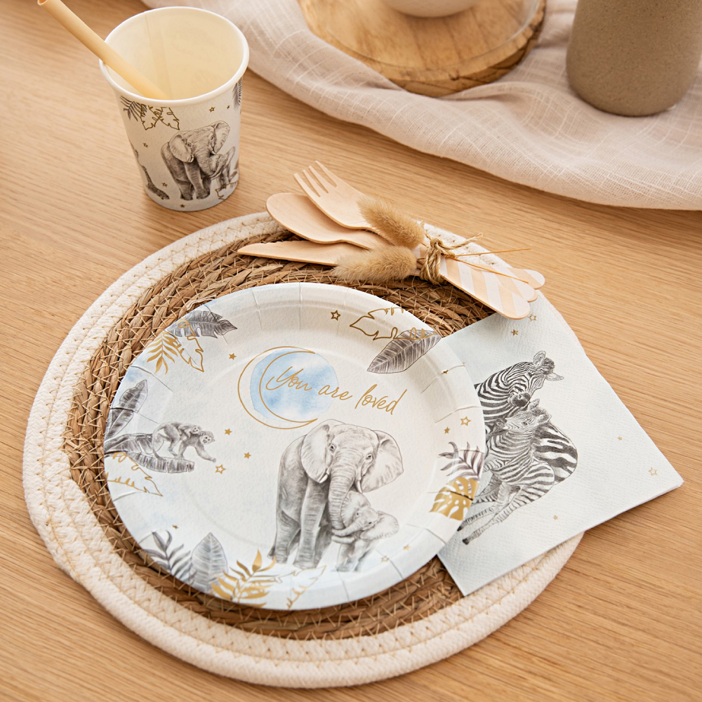 Voeg een schattige touch toe aan je feest met deze safari thema borden! Perfect voor een geboorte of babyshower, deze borden zijn zowel functioneel als decoratief. Ze zijn beschikbaar in de kleuren blauw, roze en nude.
