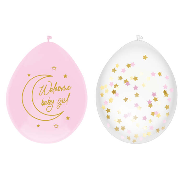 - Aantal: 6 ballonnen (3 transparant met confetti en 3 roze met opdruk)