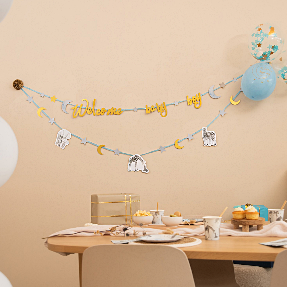 Vier de geboorte van je baby met deze vrolijke letterslinger 'Welcome Baby Boy'. De slinger is 2,5 meter lang en is een ideale decoratie voor geboortefeestjes en babyshowers. De stijlvolle letters en de zachte kleuren maken het een mooie aanvulling op je feestversiering. Gemaakt van papier, is het zowel licht als eenvoudig op te hangen.