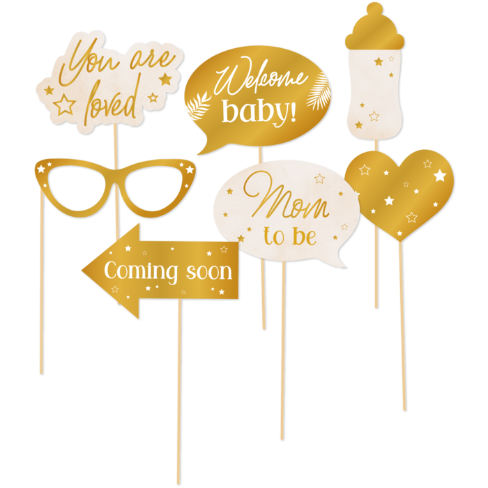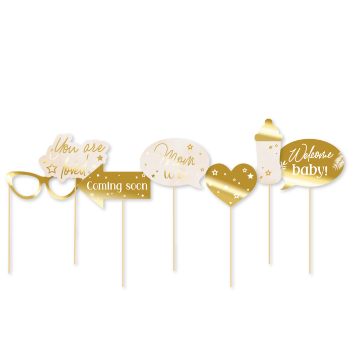 Maak elke foto extra leuk en feestelijk met deze Photobooth Props! Deze set van 7 props is perfect voor gebruik tijdens een gender reveal party of babyshower. De props zorgen voor vrolijke en gezellige foto's die de herinneringen aan deze speciale dag nog mooier maken.