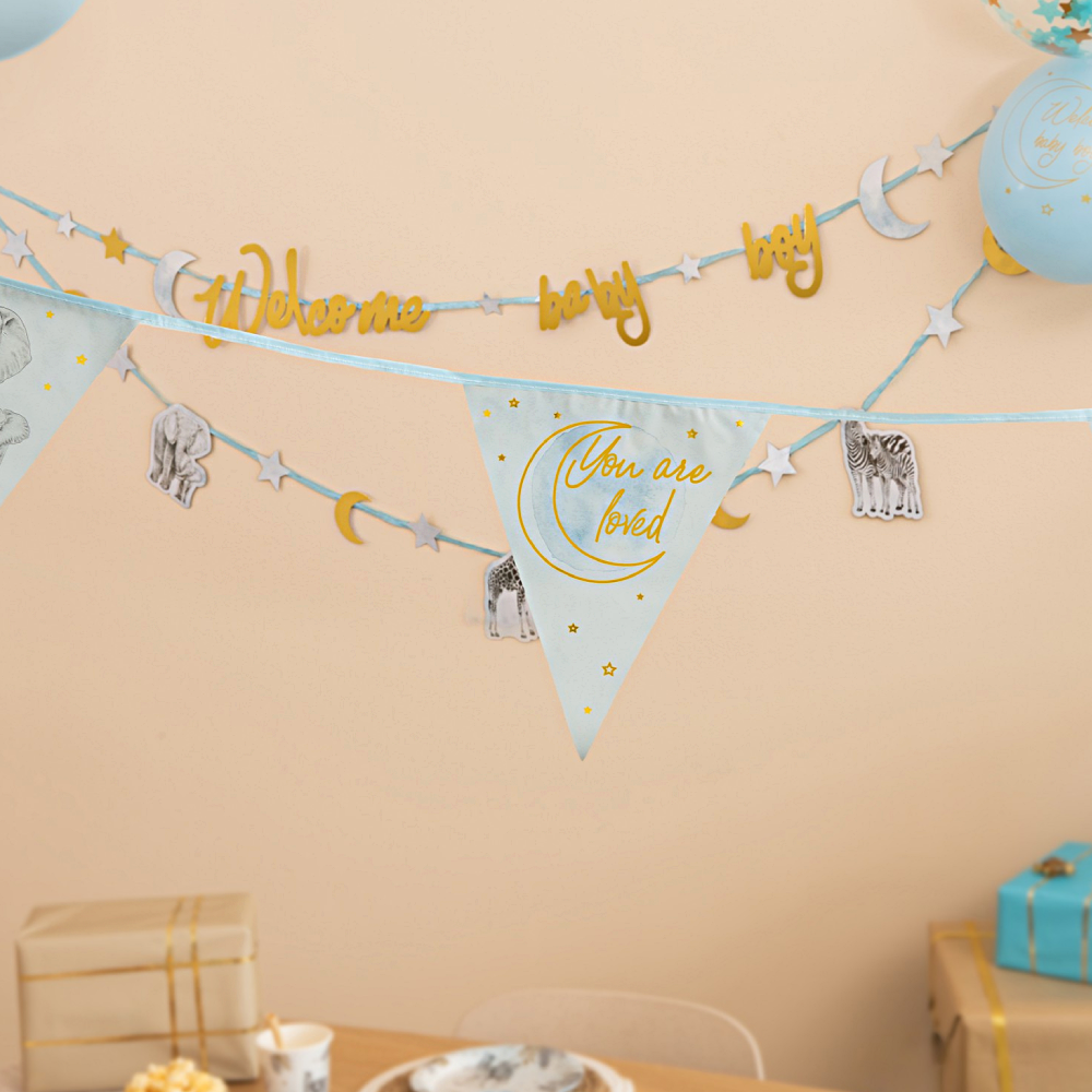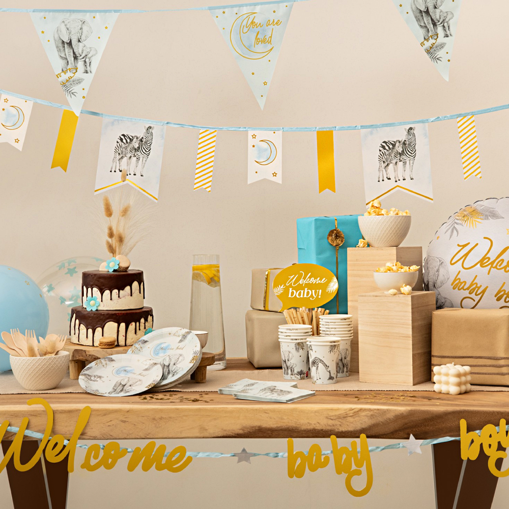 Breng een feestelijke sfeer naar je babyshower of geboorte met deze vlaggenlijn in safari-thema. Met een lengte van 6 meter is het een perfecte decoratie om je ruimte op te fleuren. De vlaggenlijn is gemaakt van papier en is verkrijgbaar in verschillende kleuren, waaronder Roze, blauw en nude, zodat je kunt kiezen wat het beste bij je feest past.